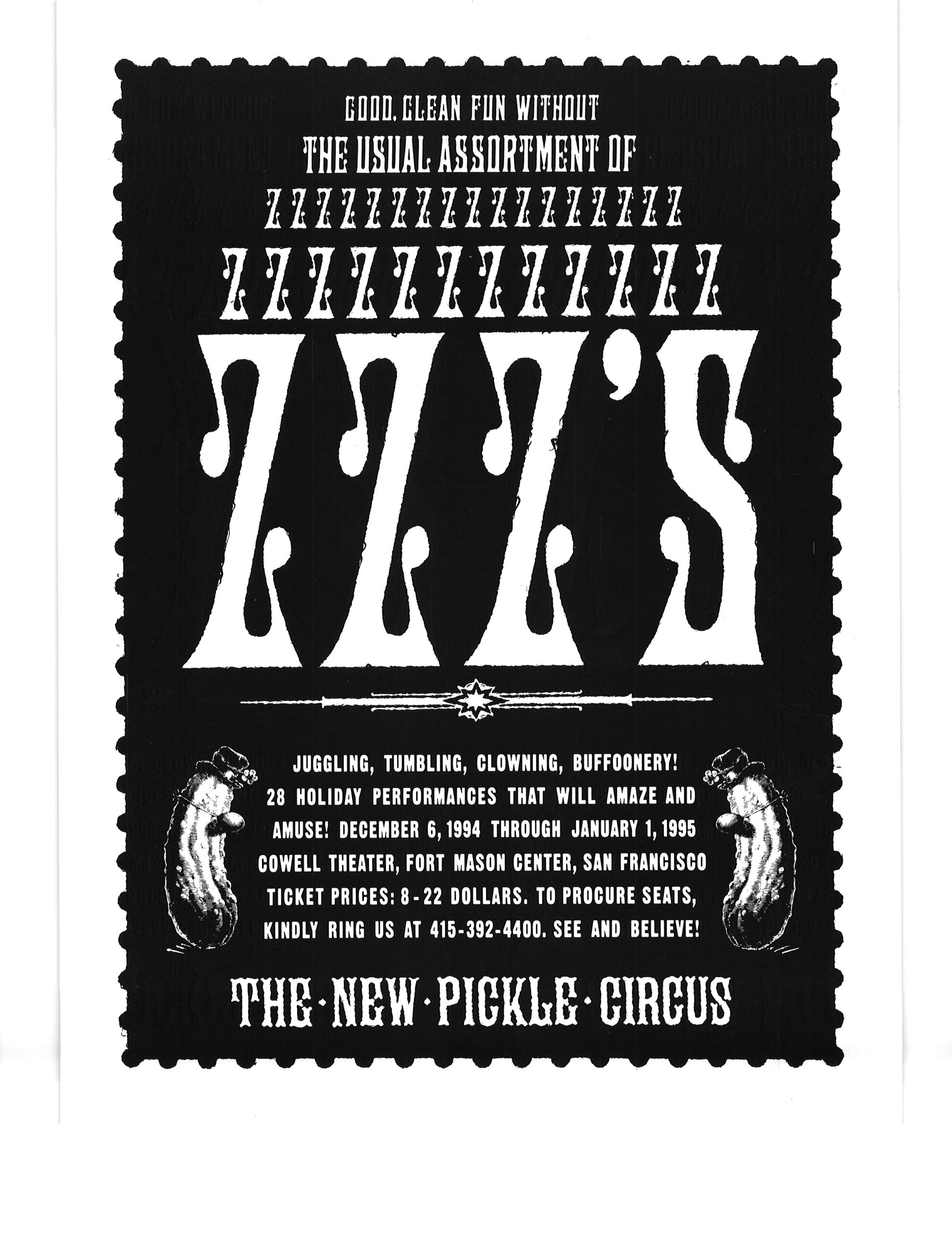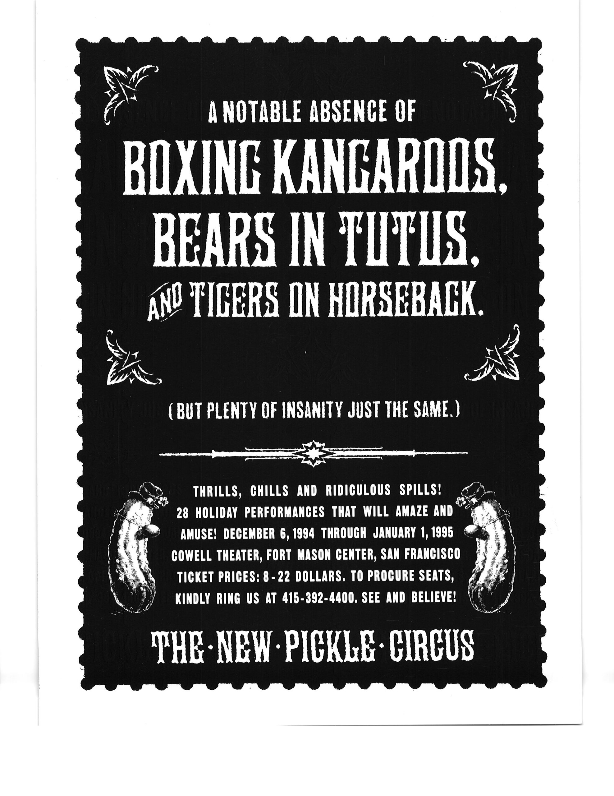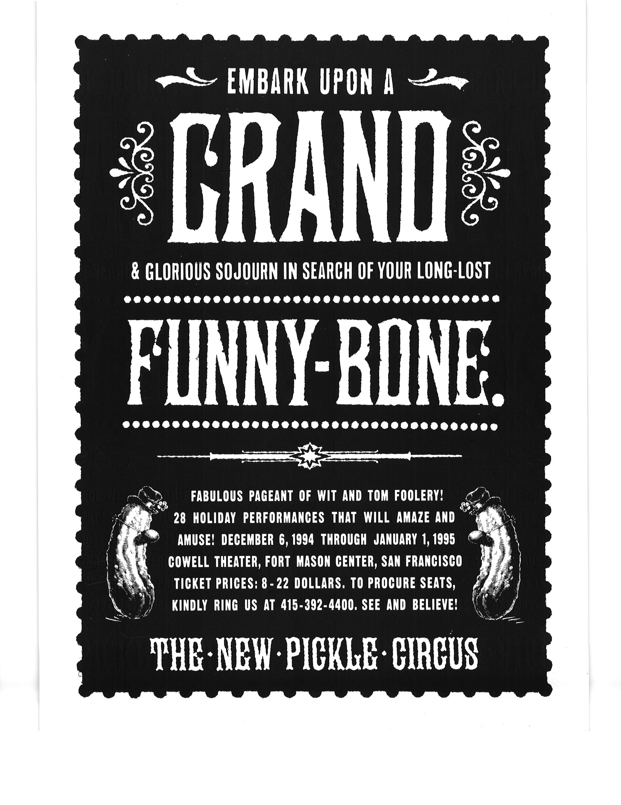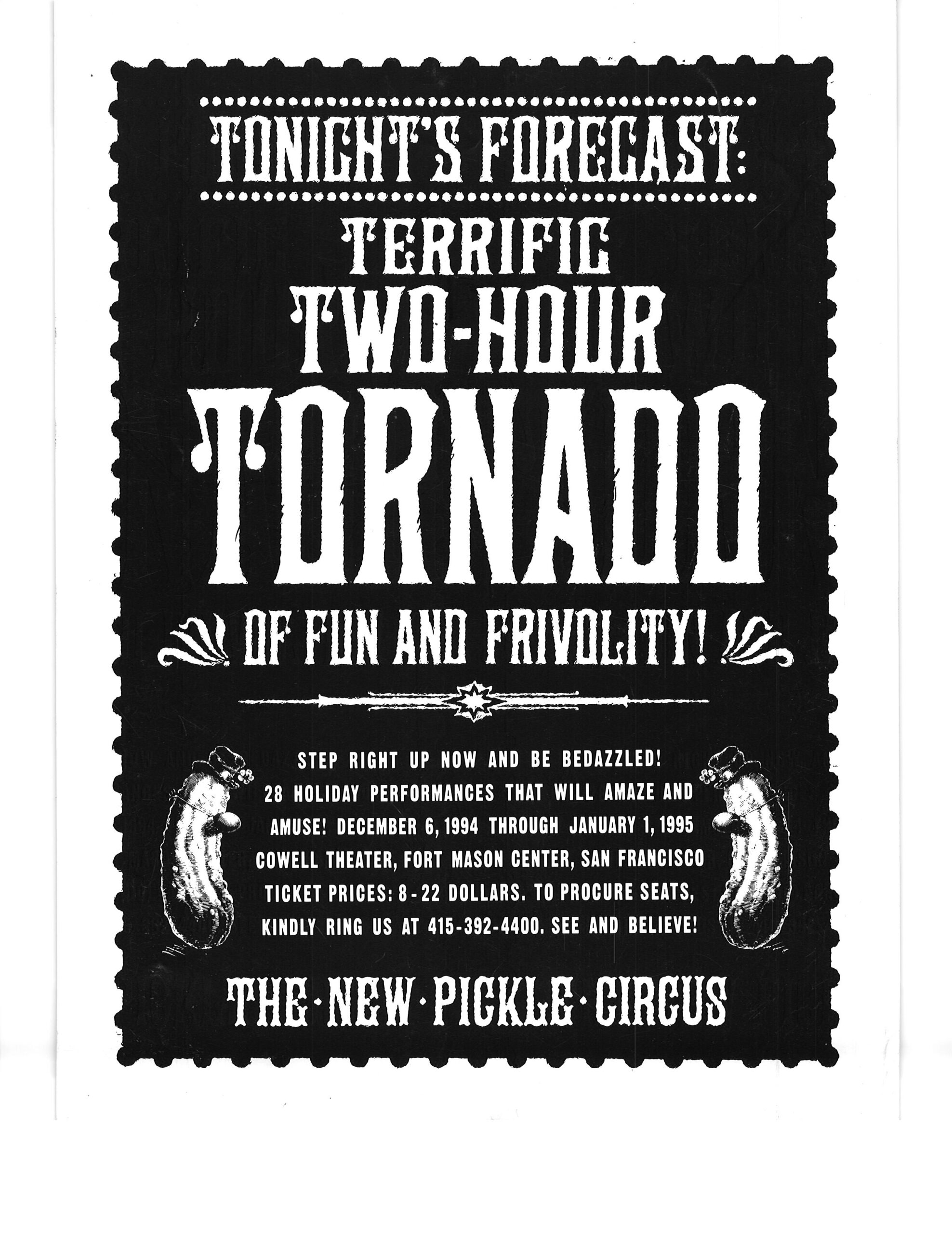 I got these posters at a New Pickle Show in San Francisco CA in winter 1995.  After the collapse of the Pickle Family Circus on the road in the early 1990’s, the group re-formed under the choreographer/director Tandy Beal‘s direction, and a lot of the same cast members stayed with the show.  I think the show ran a couple of more years after that.