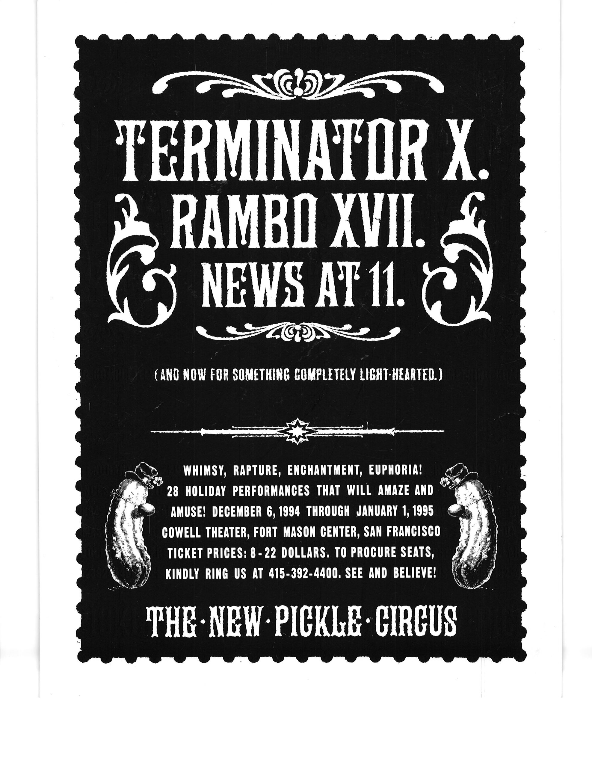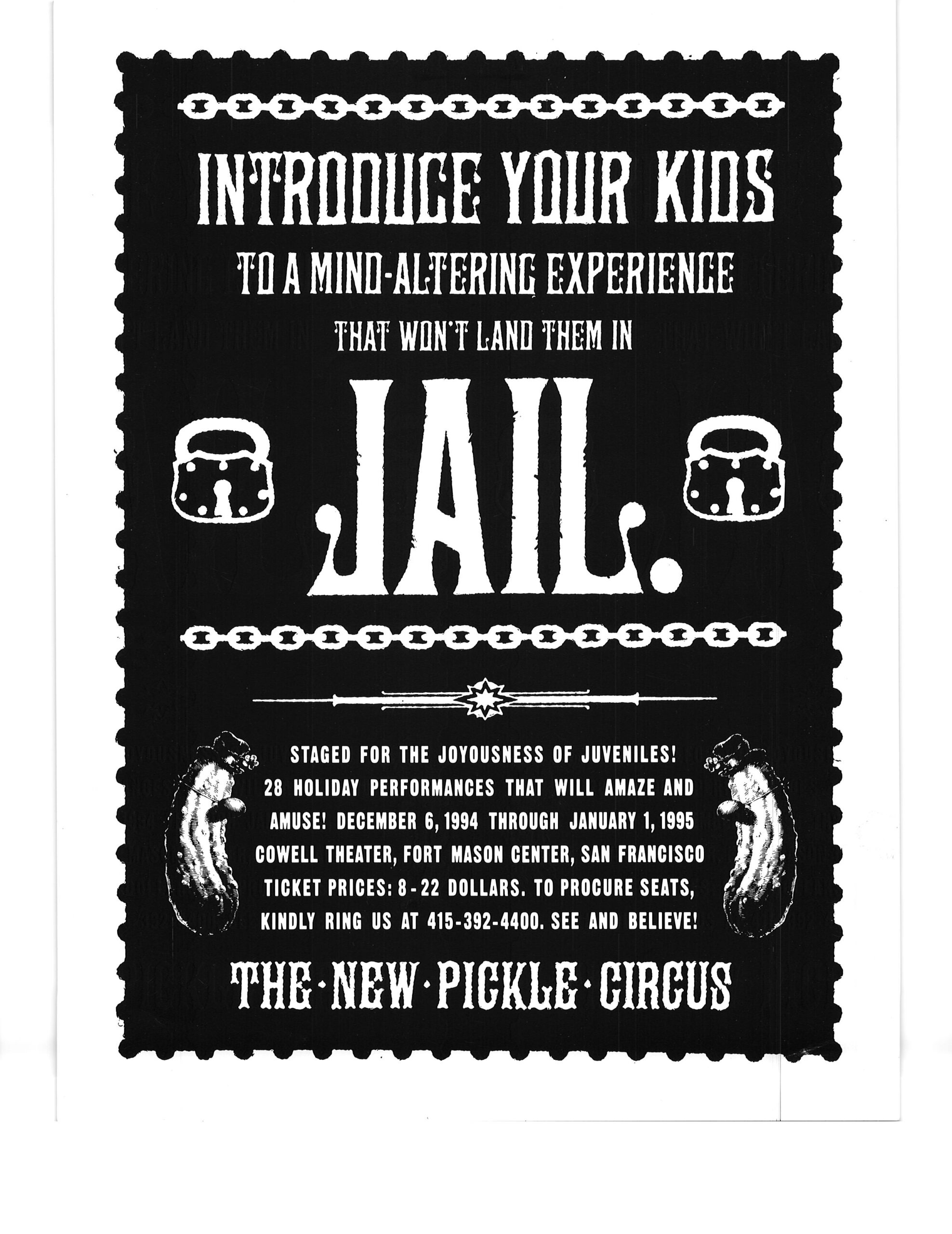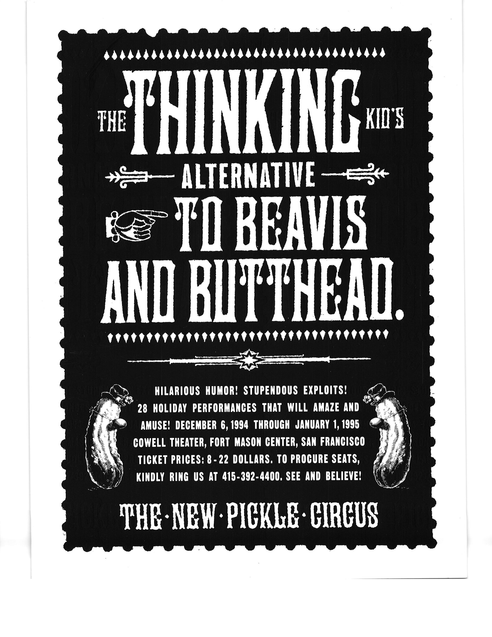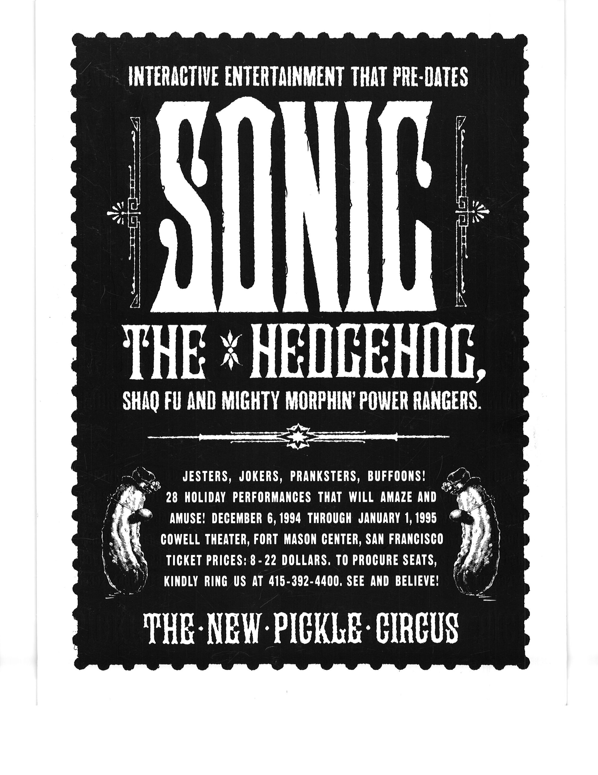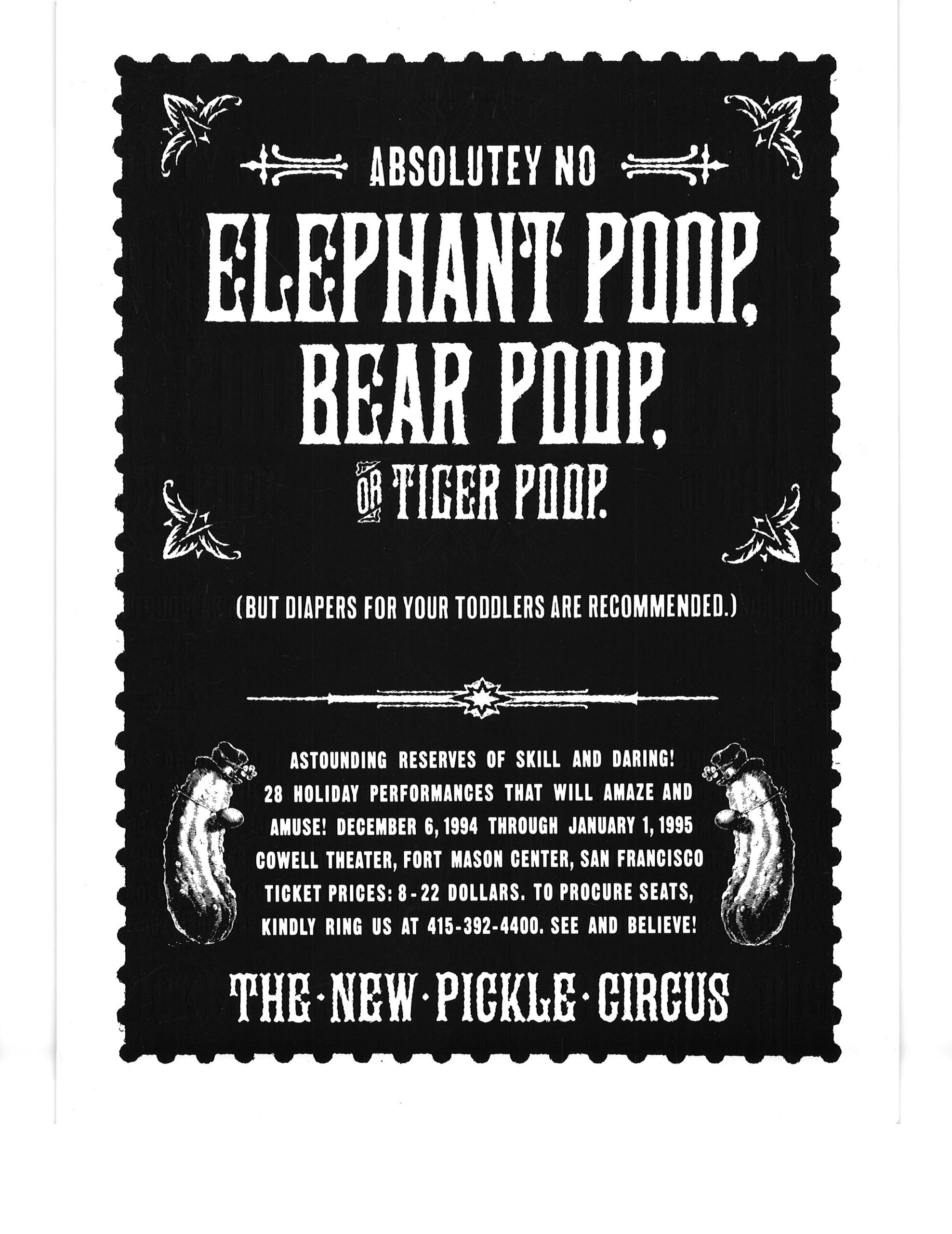I got these posters at a New Pickle Show in San Francisco CA in winter 1995.  After the collapse of the Pickle Family Circus on the road in the early 1990’s, the group re-formed under the choreographer/director Tandy Beal‘s direction, and a lot of the same cast members stayed with the show.  I think the show ran a couple of more years after that.
