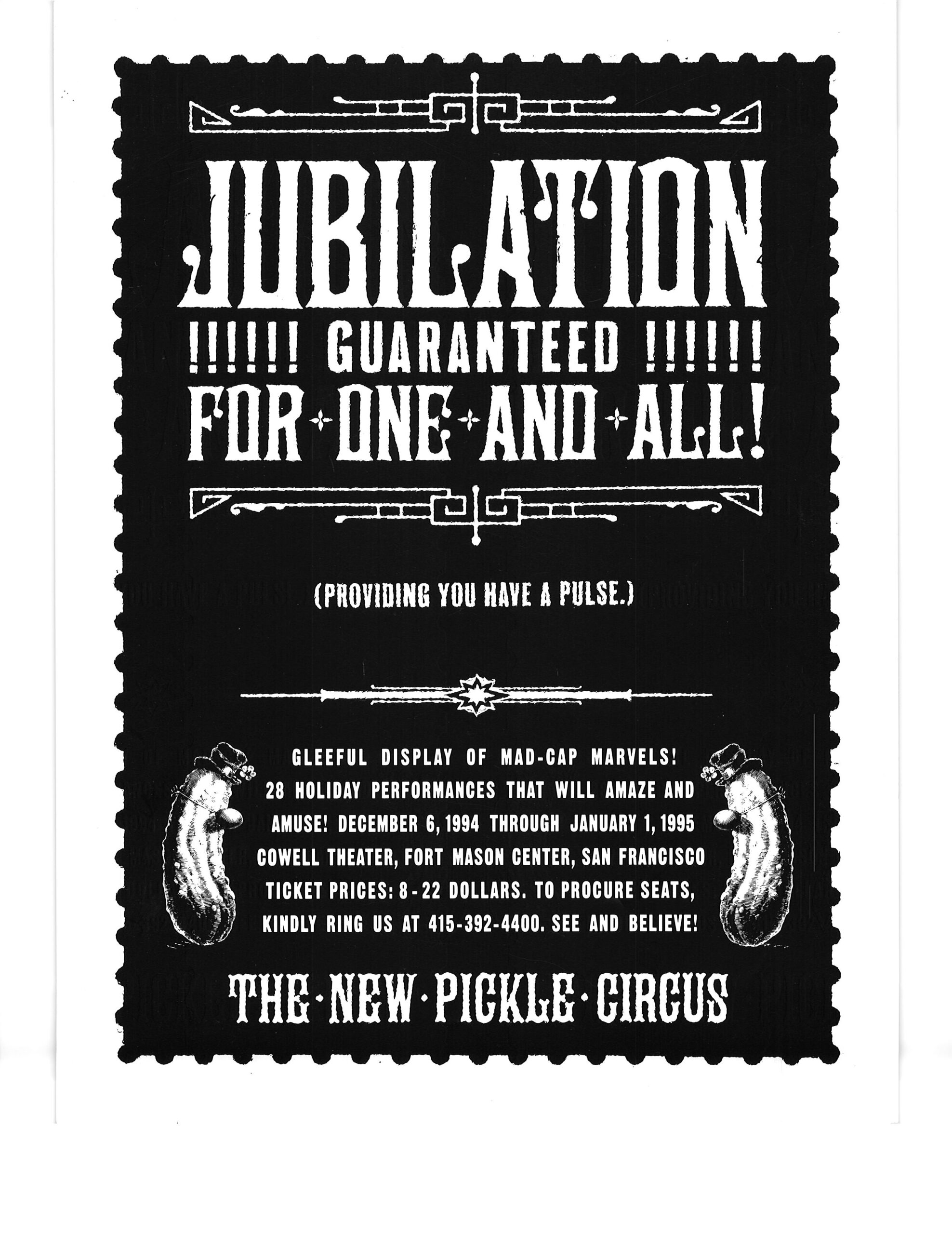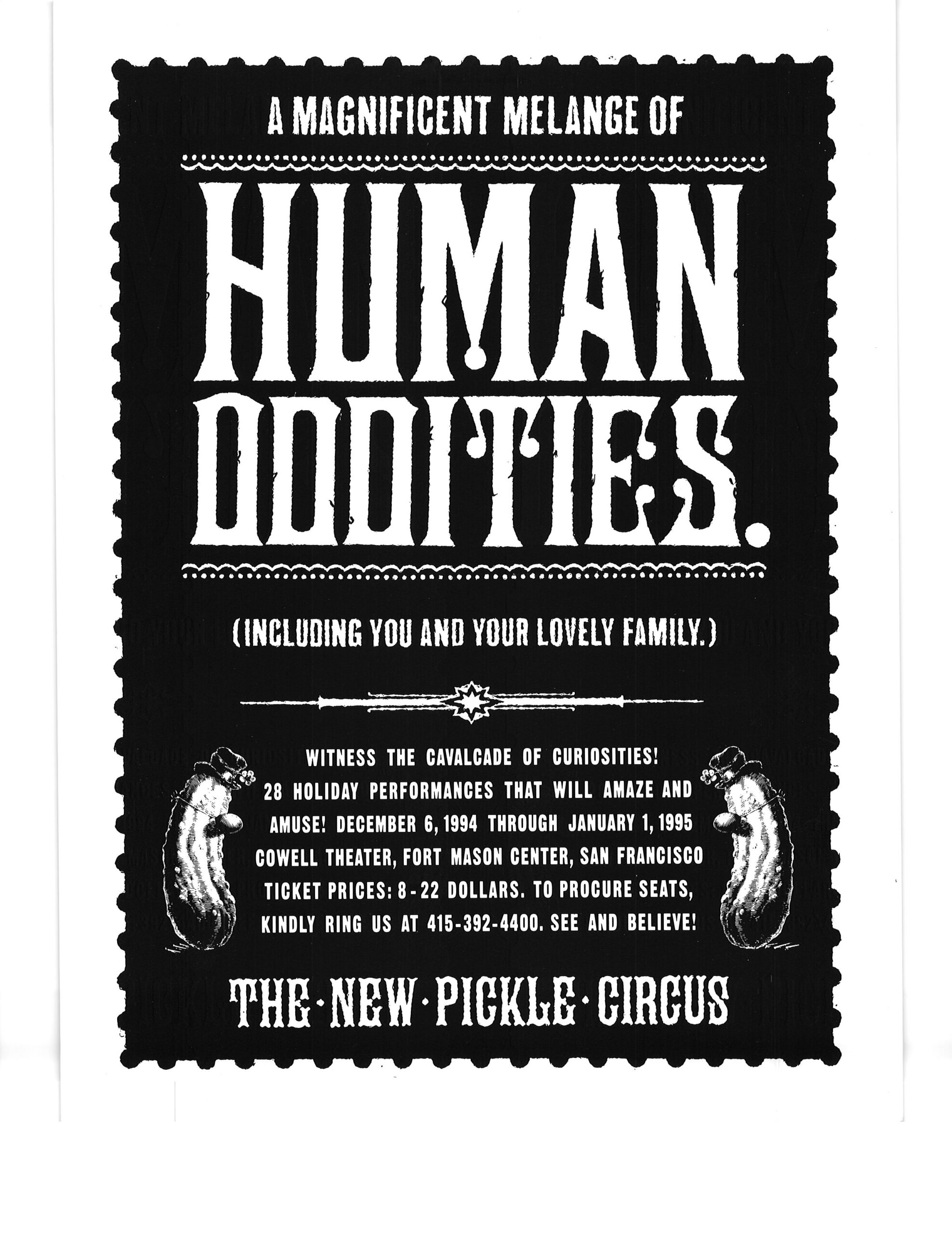I got these posters at a New Pickle Show in San Francisco CA in winter 1995. After the collapse of the Pickle Family Circus on the road in the early 1990’s, the group re-formed under the choreographer/director Tandy Beal‘s direction, and a lot of the same cast members stayed with the show. I think the show ran a couple of more years after that.