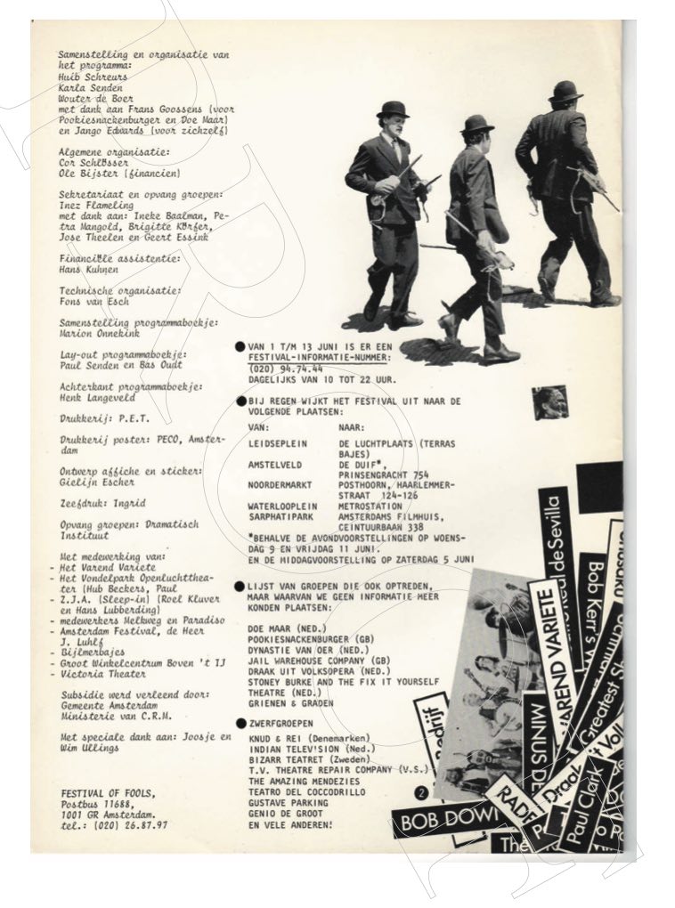 A book has recently come out about the history of the Fools Festival.  Amsterdam’s Compleat Fools by Johnny Melville and Michael Evans.  The book is a massive tome that features the history of the festival, but not in a scholarly way.  I don’t want to mistake this– there is a lot of scholarship involved.  But the history is told mostly by its participants and by the hundreds of photographs and scans of posters, programs, newspaper articles. This is less a history book and more a compilation of primary sources about the convergence of clown and mime into theatre in the 1970’s.  But it’s much more entertaining than that!Compleat Fools book